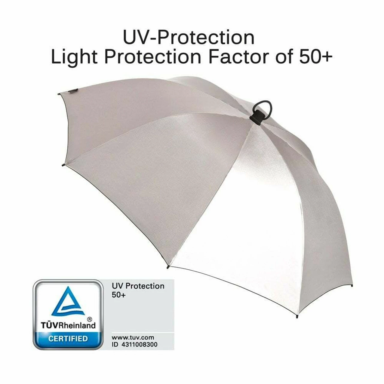 The silver UV-light protective coating is especially recommended for the protection against sun and heat. It is almost completely resistant against harmful UV-radiation and offers a TÜV certified light protection factor of UPF 50+ (Australia/New Zealand Standard). In addition, the silver-metallic-coating reflects the heat very efficiently so that it is considerably cooler under the umbrellas with silver UPF 50+-coating than under umbrellas with a normal canopy.