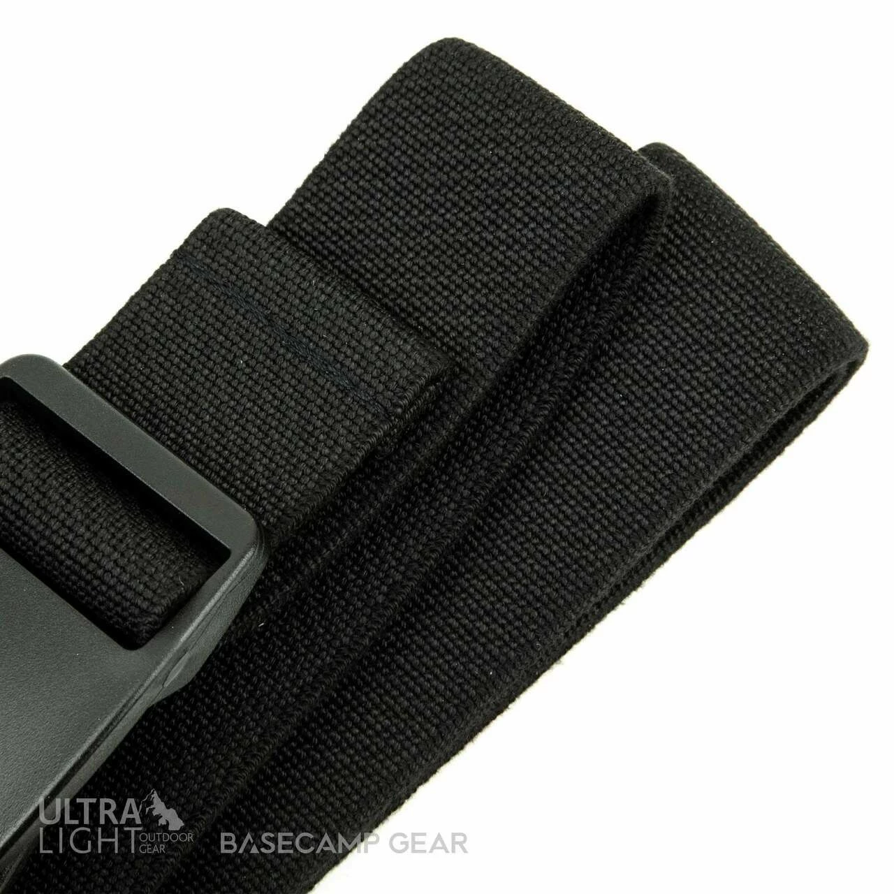 Comfortable elastic belt. Easily adjusted plastic buckle with a flat profile that sits well under a backpack’s hipbelt.