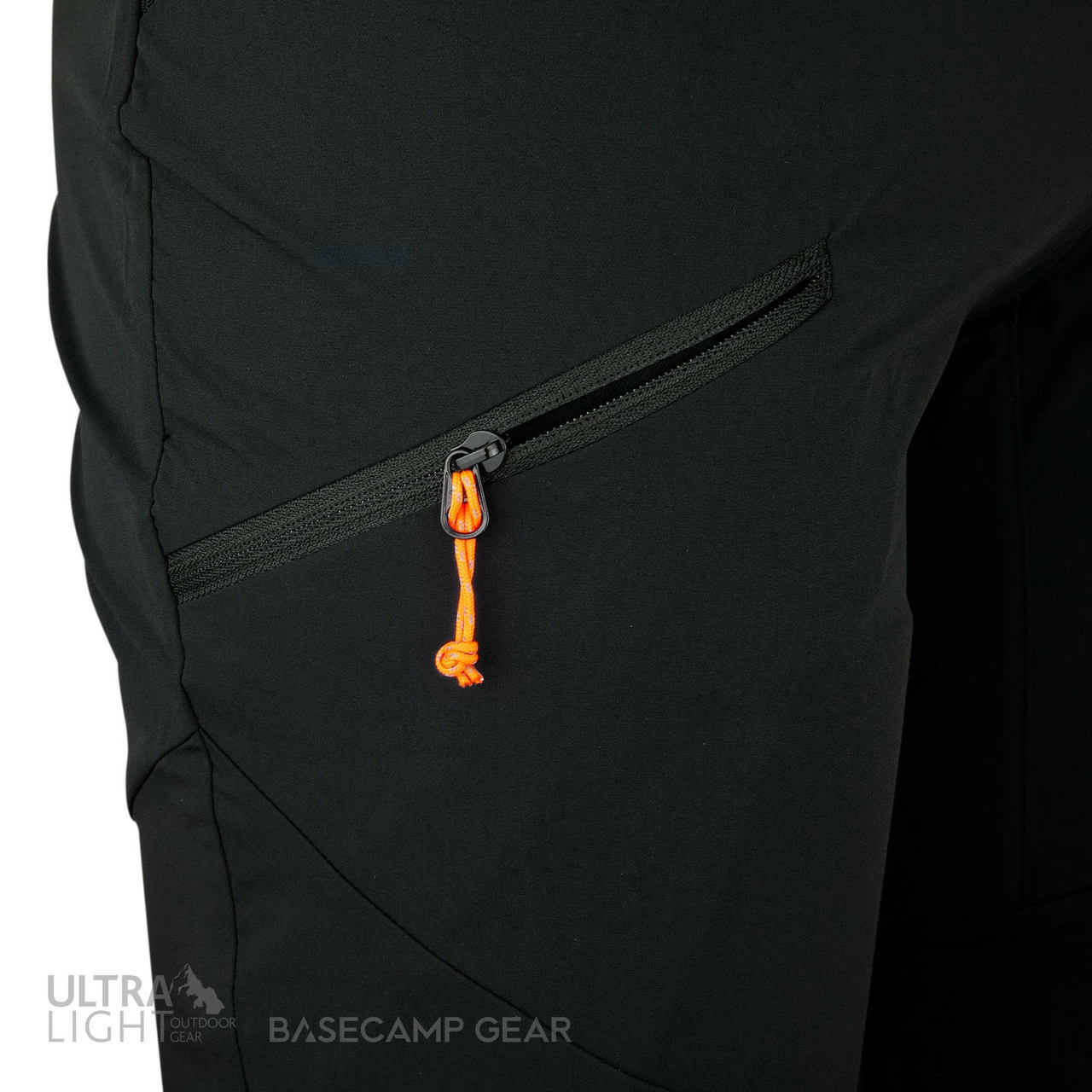 The softshell material provides enough stretch but it is also breathable for when things heat up. There is a good amount of water repellency in the fabric. All the pockets are secure enough for important bits with zip closures which, again is a nice touch for practical outdoor pants.
