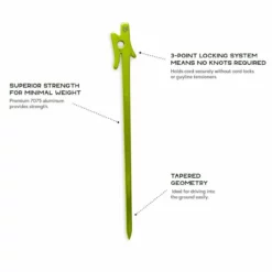 The Airpin stakes are a fantastic needle peg design with a difference. The ability to quickly lock off guy lines without the need to tie knots is great.