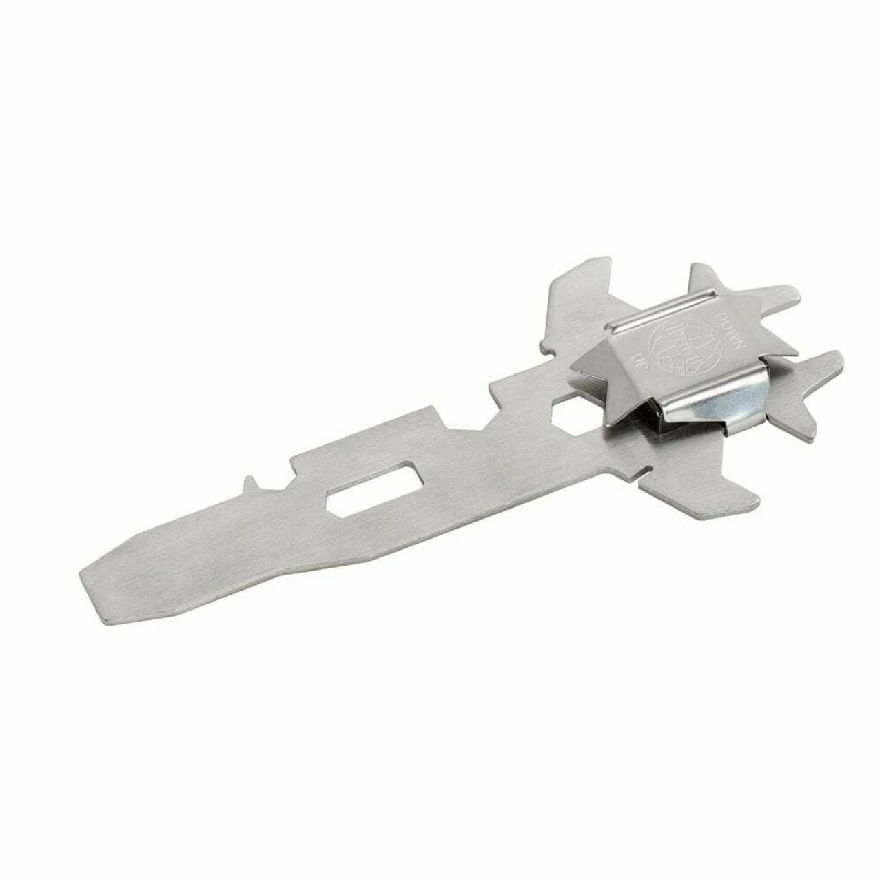 Multitool for Optimus Nova and Nova+. Service functions: 11 mm key forburner bottom nut, 10 mm key for fuel hose change, hook for pump valve, 7 mm key for pump leather cup, 8 mm slot for spindle nut, 6 mm key, screwdriver for jet adjustments, cleaning magnets, 12 mm key, slot for adjusting burner plate legs.