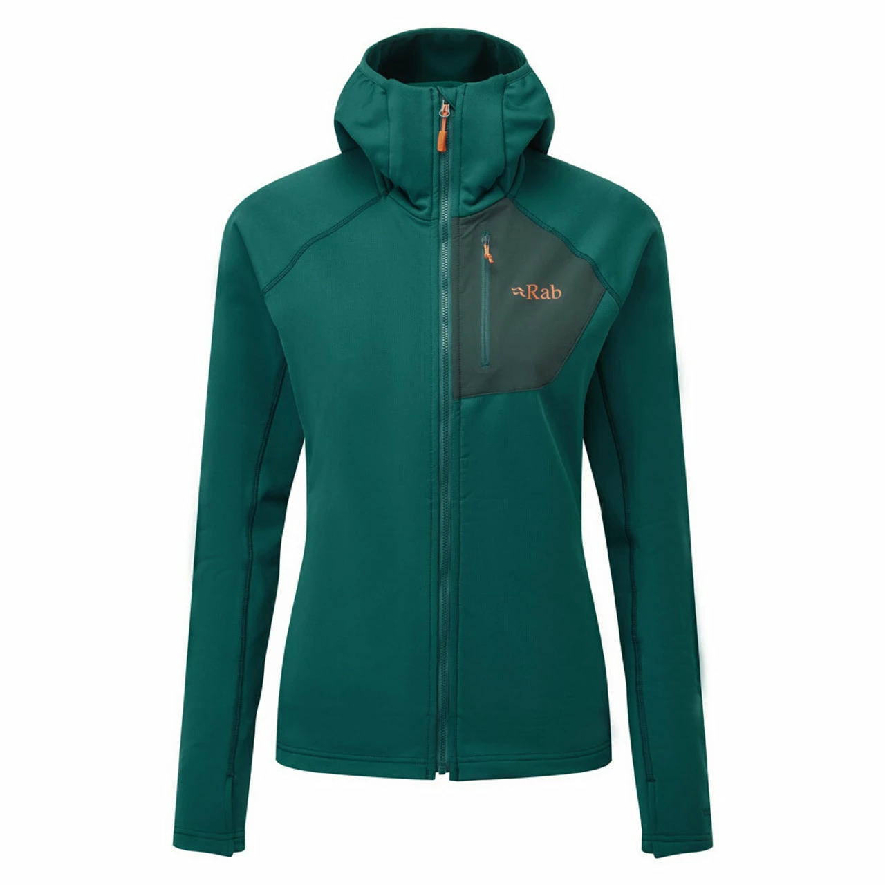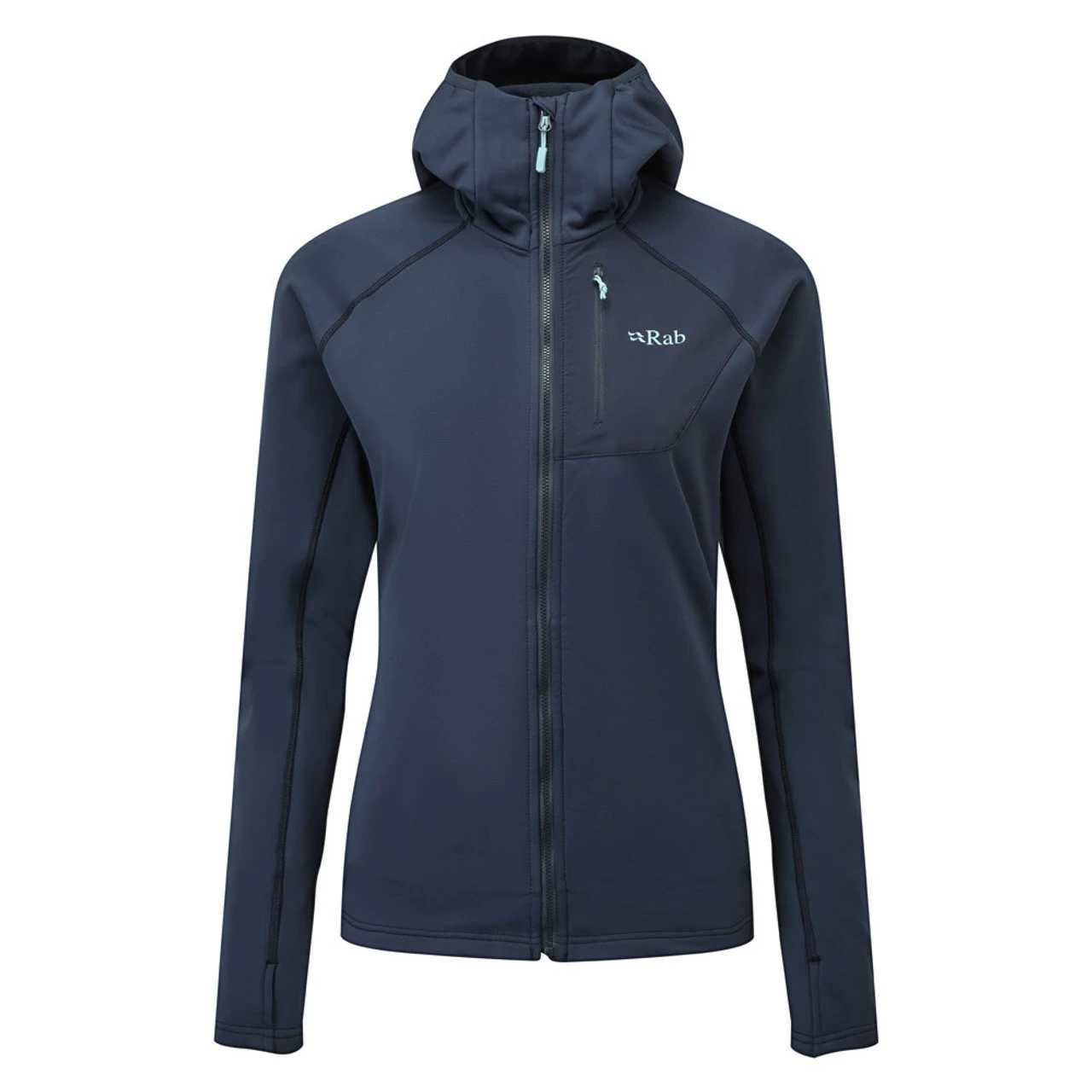 Rab’s 2020 Womens Superflux Hoody is a versatile piece, as it can be comfortable worn as a mid layer in cold temperatures or as an outer layer on warmer days. The technical Thermic fleece fabric provides a good amount of warmth with effective moisture management. It uses different textures on the inside and outside to achieve this. The outer has a smooth durable surface and the inside has a grid pattern which provides warmth without compromising breathability.