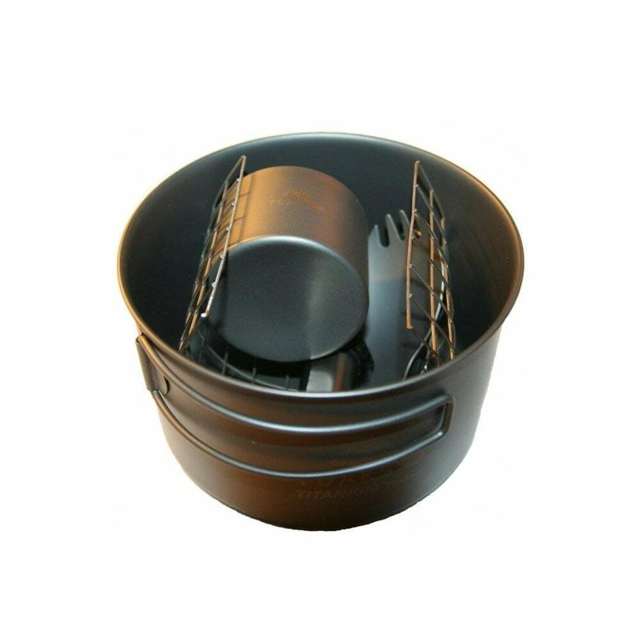 - This cooking system includes a TOAKS LIGHT Titanium 700ml D115mm Pot, a Titanium Siphon Alcohol Stove, a Stove Frame, a Titanium Folding Spork and a Titanium Windscreen (580mm x 110mm)